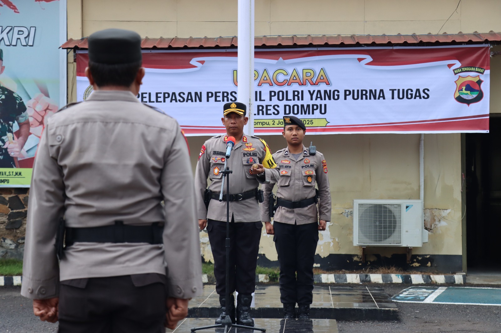 Pada hari Kamis, 2 Januari 2025, pukul 07.30 Wita, bertempat di Lapangan Apel Polres Dompu, telah dilaksanakan upacara pelepasan personel purna tugas Polres Dompu yang dipimpin langsung oleh Kapolres Dompu, AKBP Zulkarnain, S.I.K. Kegiatan tersebut dihadiri oleh Wakapolres Dompu, KOMPOL Jamaludin, S.Sos, PJU Polres Dompu, Bhayangkari Polres Dompu, serta seluruh personel Polres Dompu yang turut menyaksikan acara penuh haru tersebut.