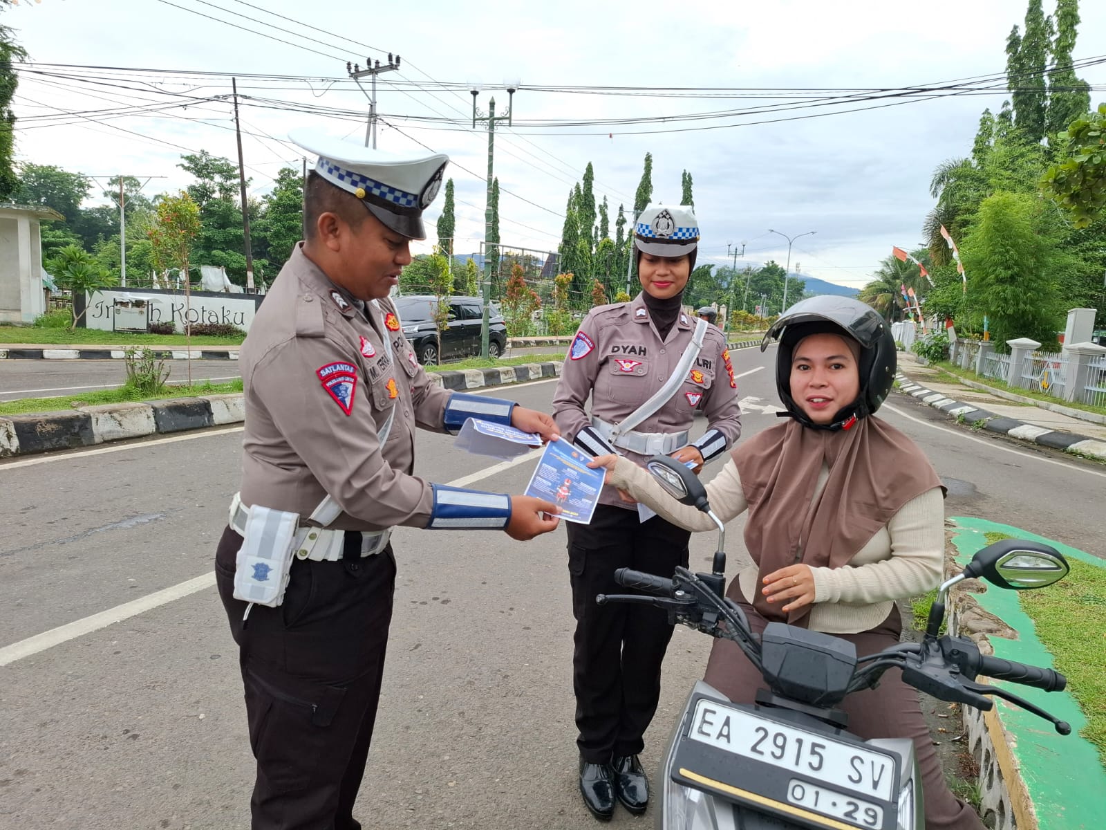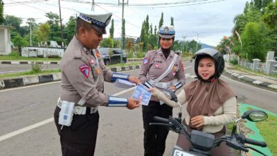 Kota Bima, NTB (03 Januari 2025) – Satuan Lalu Lintas (Sat Lantas) Polres Bima Kota melaksanakan kegiatan pembagian brosur keselamatan berlalu lintas kepada pengendara roda dua dan roda empat pada Jumat (3/1). Kegiatan berlangsung mulai pukul 07.30 WITA di perempatan lampu merah Gunung Dua, Kota Bima.
