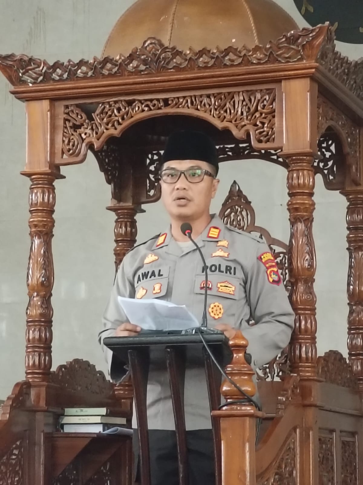 Dalam khutbahnya, Kapolsek Awaluddin mengajak jama’ah untuk selalu menjaga dan menciptakan situasi kamtibmas (keamanan dan ketertiban masyarakat) yang kondusif di tengah-tengah masyarakat. Beliau menekankan pentingnya peran serta seluruh elemen masyarakat dalam menjaga keamanan bersama.