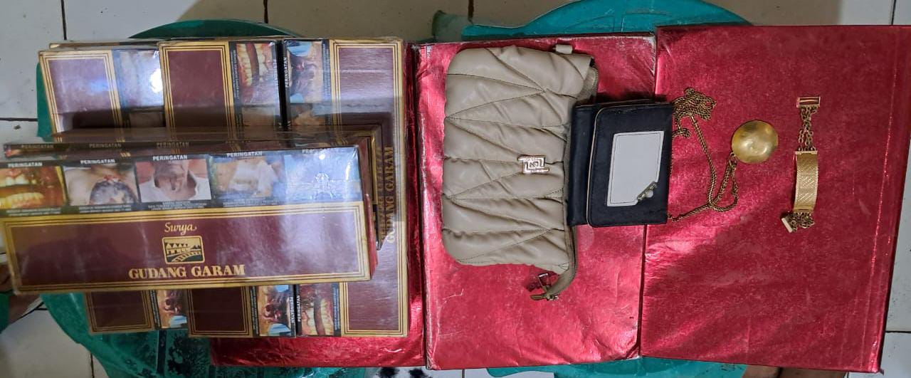 Selama interogasi dan pemeriksaan badan yang dilakukan pada pukul 11.55 WITA, tim menemukan barang bukti berupa satu kalung emas dan satu gelang emas yang disembunyikan oleh pelaku di dalam celana dalamnya. Barang tersebut diikatkan mengelilingi paha bagian dalam pelaku untuk menghindari deteksi.