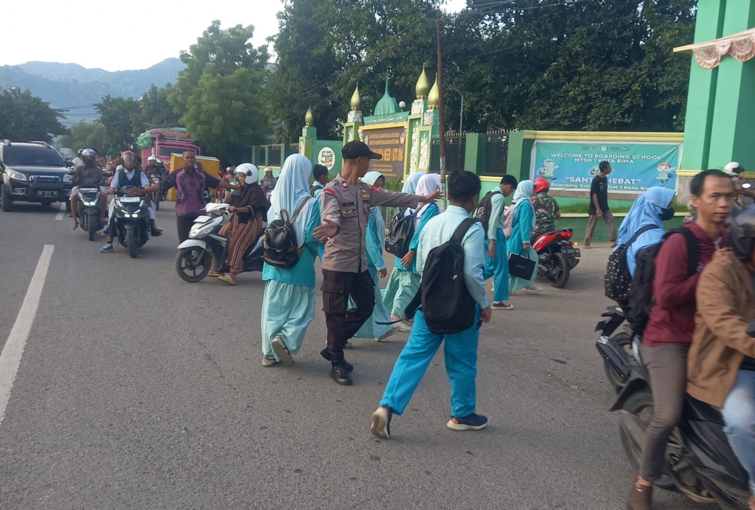 Selain membantu siswa, personel kepolisian juga mengatur arus kendaraan guna memastikan kelancaran lalu lintas di kawasan tersebut, yang biasanya padat pada jam-jam tertentu.