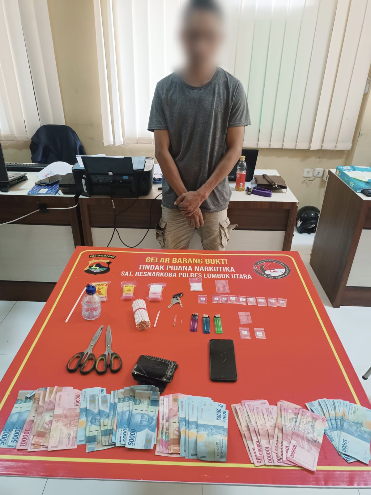 SB (44) seorang pria yang berasal dari Kecamatan Sambelia Kabupaten Lombok Timur, dibekuk oleh Tim Opsnal Sat Res Narkoba Polres Lombok Utara pada hari Minggu, 5 Januari 2025, di sebuah bengkel, desa Sambelia, Lombok Timur.