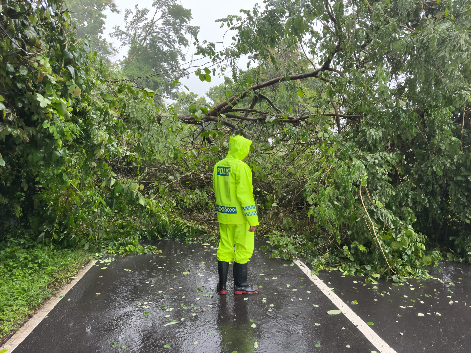 “Penanganan darurat yang telah dilakukan, BPBD bersama personel giat lainnya memotong pohon tumbang tersebut agar jalur bisa kembali normal dan pembersihan puing bekas pohon tumbang