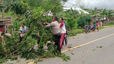 Polsek Poto Tano Bersama Masyarakat Respon Cepat Evakuasi Pohon Tumbang di Jalan Utama