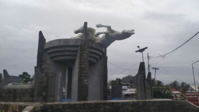 Lombok Utara – Akibat hujan lebat dan angin kencang yang melanda Kecamatan Kayangan merubuhkan patung kuda di bundaran Simpang rest area kayangan, Kecamatan Kayangan, Minggu, 9 Februari 2025.