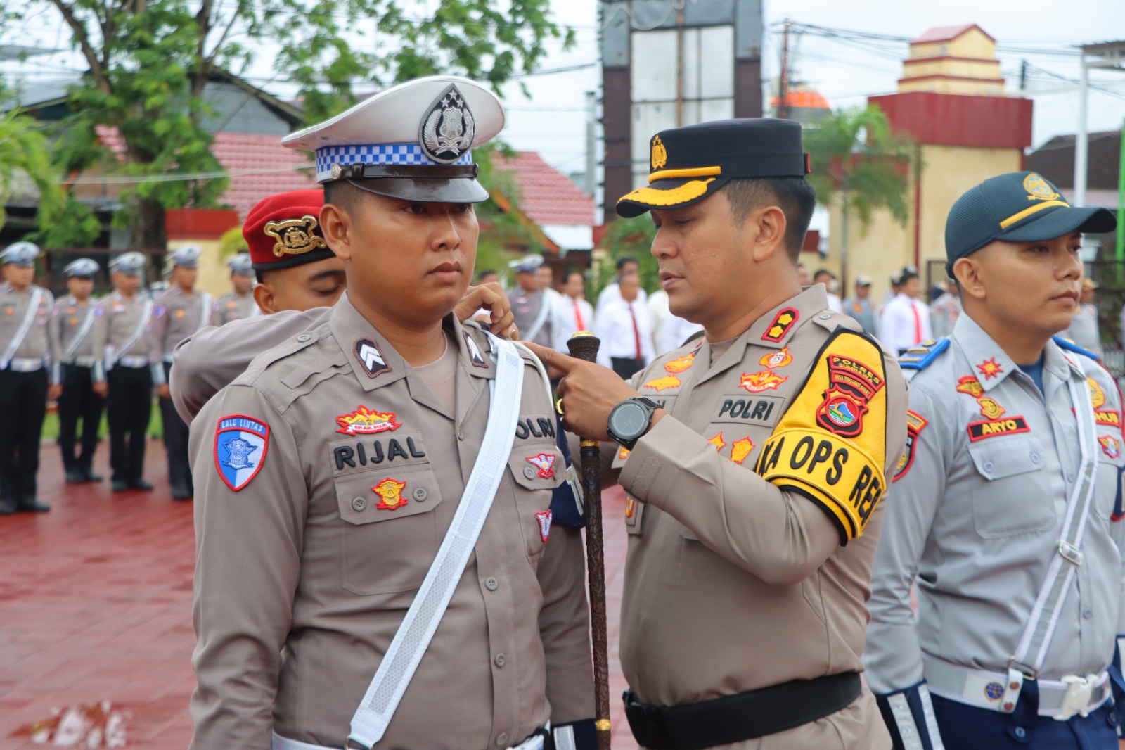 Sebelum menyampaikan kata sambutannya, Kapolres Sumbawa melakukan pemeriksaan pasukan dan penyematan pita kepada perwakilan personel.