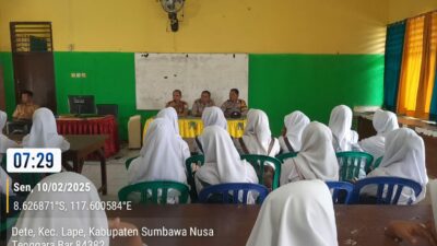 Sumbawa Besar-NTB, Polsek Lape melalui Wakapolsek Lape IPDA Mansyur bersama Bhabinkamtibmas Desa Dete Bripka I Nyoman Kartika menggelar program “Police Goes to School” dengan mengunjungi SMPN 1 Lape di Desa Dete, Senin (10/02/25) pagi.