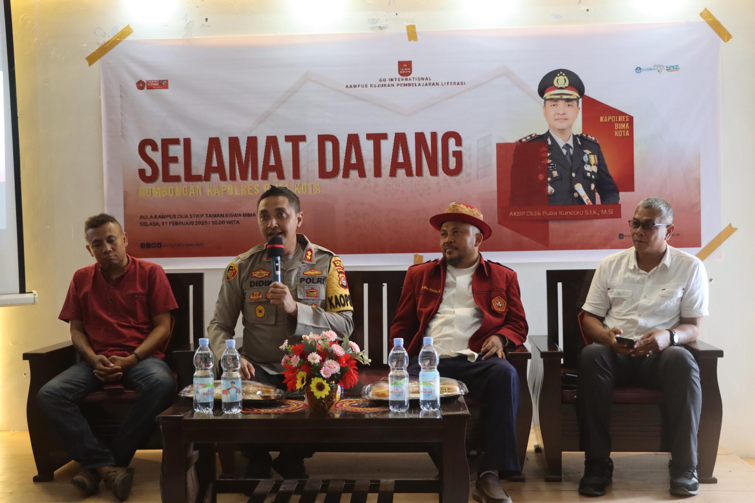 Kota Bima, NTB (11 Februari 2025) – Kapolres Bima Kota, AKBP Didik Putra Kuncoro, S.I.K., M.Si., melakukan silaturahmi dengan pimpinan dan dosen STKIP Taman Siswa Bima Kampus II, yang berlangsung di Kampus II STKIP Taman Siswa Bima, Kelurahan Jatiwangi, Kecamatan Asakota, Kota Bima. Acara ini dimulai pada pukul 10.30 WITA dan dihadiri oleh berbagai pihak dari kepolisian maupun civitas akademika kampus.