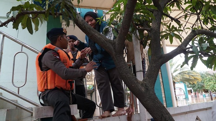 Dalam rilis Itwasum Polri, tim SAR dari Pasukan Pelopor Korps Brimob mengevakuasi warga terjebak banjir di Tambun, Bekasi, Jawa Barat (Jabar). Mereka juga membawakan bahan makanan untuk warga terdampak banjir