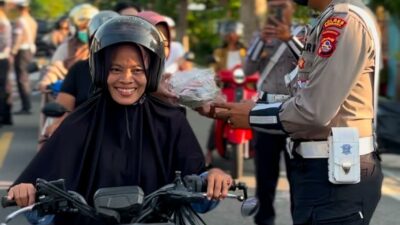 Sumbawa Besar–NTB, Personel Satlantas Polres Sumbawa melaksanakan kegiatan sosial dengan membagikan takjil kepada pengendara yang masih berada di jalan menjelang waktu berbuka puasa.