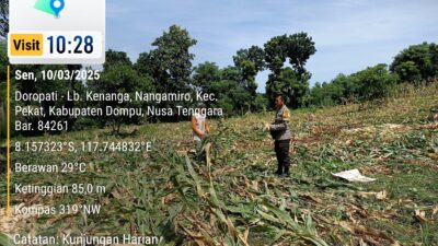 Bhabinkamtibmas Desa Nangamiro, Polsek Pekat, Brigadir Lalu Taufik Insani, melaksanakan pemantauan panen raya di lahan milik Hj. Nurma di Dusun Nangamiro, Kecamatan Pekat, Kabupaten Dompu, Senin (10/3/2025). Kegiatan ini merupakan bagian dari Program Ketahanan Pangan Nasional menuju Indonesia Emas 2045.