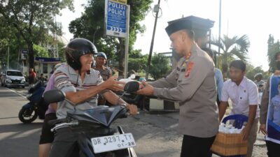 Lombok Tengah (NTB) – Semangat berbagi di bulan suci Ramadan, Kapolres Lombok Tengah, AKBP Iwan Hidayat, SIK bagikan takjil gratis kepada masyarakat yang melintas di depan Mapolres Lombok Tengah, Rabu (12/3).