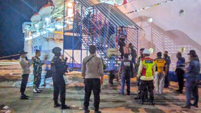 Kota Bima, NTB (3 April 2025) – Personel Pos Terpadu Pelabuhan Bima melaksanakan pengamanan dan pemantauan terhadap arus balik penumpang kapal KM. BINAIYA yang tiba di Pelabuhan Bima pada Kamis (3/4) pukul 01.50 WITA. Kegiatan ini berlangsung di area Pelabuhan Bima, Jalan R.E. Marthadinata, Kelurahan Tanjung, Kecamatan Rasanae Barat, Kota Bima.