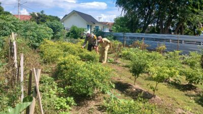 Bripka M. Hairil F. melakukan pendampingan pengelolaan Pekarangan Pangan Bergizi kepada warga binaan, Bapak Sabi Said, selaku pemilik lahan yang ditanami tanaman berupa terong, cabai, pisang, dan singkong.
