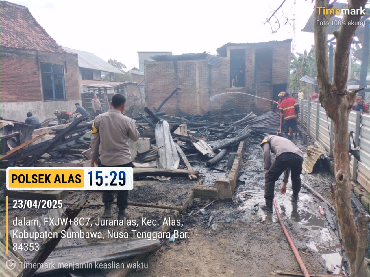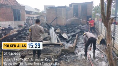 Sumbawa Besar-NTB, Musibah kebakaran hebat melanda Dusun Dalam, Desa Dalam, Kecamatan Alas, Kabupaten Sumbawa pada hari Rabu (23/4/2025) sekitar pukul 14.00 WITA. Api dengan cepat membesar dan melalap sejumlah rumah warga akibat cuaca panas terik dan hembusan angin kencang.