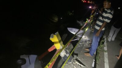 “Kondisi jalan yang sedikit berpasir ditambah kecepatan tinggi membuat pengemudi kehilangan kendali. Akibatnya, kendaraan menabrak pembatas dan terperosok ke sungai,” jelas Kapolsek.