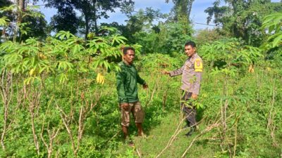 Dalam rangka mendukung Program Ketahanan Pangan Nasional menuju Indonesia Emas 2045, Bhabinkamtibmas Kelurahan Kandai 1 Polsek Dompu, AIPDA Khairil Muslim, melaksanakan pemantauan lahan pekarangan milik salah satu warga binaan, Iwan, yang tengah mengembangkan tanaman singkong dan sayuran.