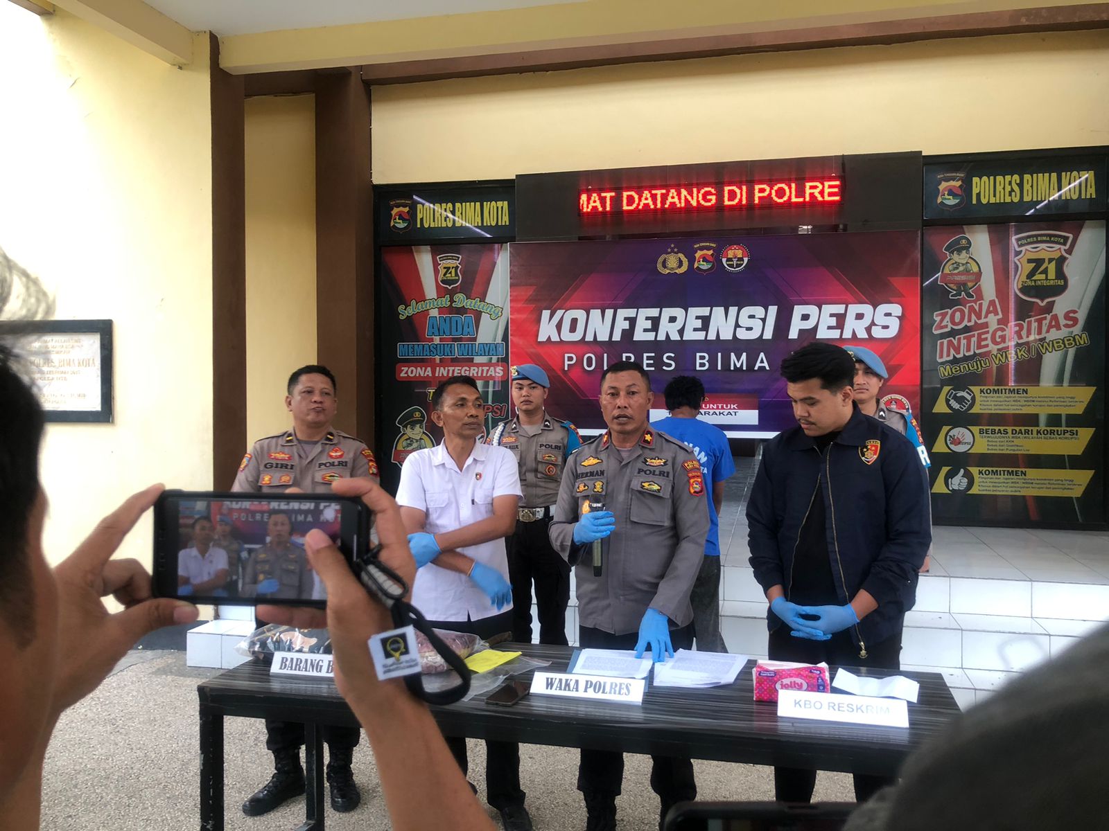 Informasi resmi ini disampaikan oleh Wakapolres Bima Kota Kompol Herman, S.H., saat menggelar konferensi pers pada Rabu sore (18/6) sekitar pukul 17.30 WITA di Mako Polres Bima Kota. Wakapolres didampingi oleh KBO Reskrim I Wayan Mariana, Kasiwas Iptu Putu Surwarjana Giri, Kanit Pidum Ipda Henry Jonathan Hutaurut, serta sejumlah pejabat utama Polres Bima Kota.