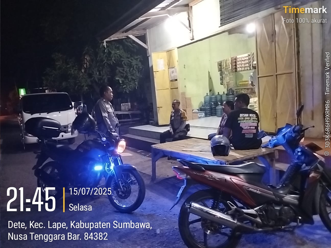 Pada hari Selasa, 15 Juli 2025, mulai pukul 21.45 WITA, tim patroli yang dipimpin oleh AIPTU KUSNINDAR (Ps KA SPKT 3) bersama AIPDA SULKARNAEN dan BRIPDA M. AGIS ALFITRAH menyisir berbagai lokasi keramaian di Kecamatan Lape dan Kecamatan Lopok, Kabupaten Sumbawa. Mereka menggunakan kendaraan dinas mobil patroli R4 inventaris Polsek Lape untuk menjangkau seluruh area sasaran.