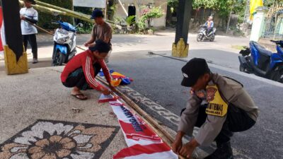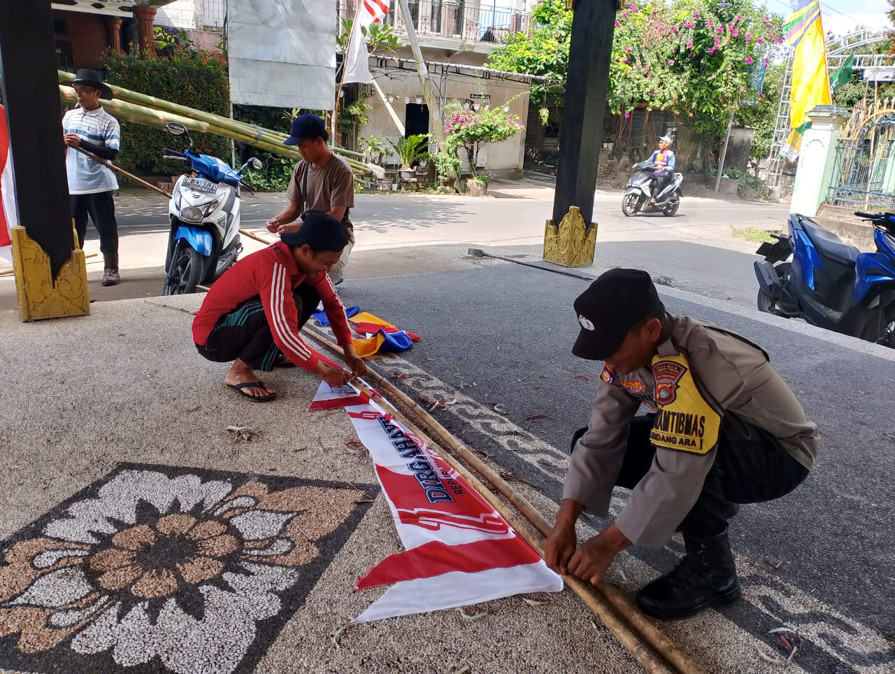 Kegiatan diawali dengan agenda gotong-royong pemasangan umbul-umbul, bendera, dan hiasan di sepanjang jalan utama dan fasilitas umum desa. Aksi ini tidak hanya bertujuan untuk memeriahkan suasana, tetapi juga menumbuhkan rasa kebersamaan dan cinta tanah air di kalangan warga. Aipda M. Muhir terlihat berbaur dengan warga, bahu-membahu menancapkan tiang dan mengikat umbul-umbul, menunjukkan kedekatan Polri dengan masyarakat.