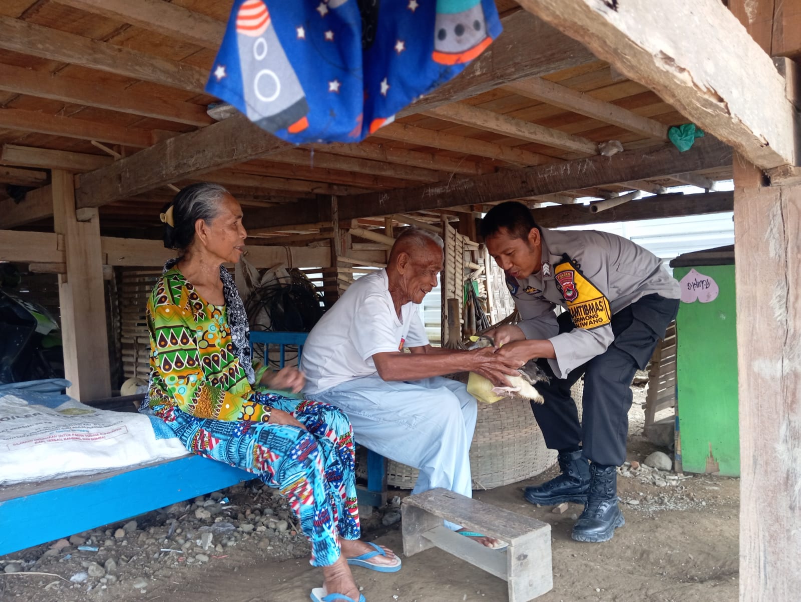 Dalam kesempatan tersebut, Bhabinkamtibmas menyerahkan bantuan berupa bibit ternak Bebek kepada pasangan lansia yang tinggal di wilayah binaannya. Kehangatan dan rasa syukur terpancar dari wajah warga penerima.