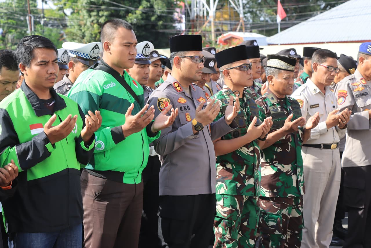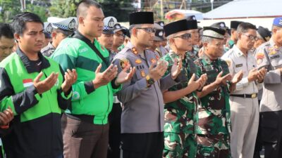 ‎‎Lombok Tengah (NTB) – Sebagai wujud sinergi dan komitmen menjaga keamanan, Polres Lombok Tengah bersama Kodim 1620/Lombok Tengah dan komunitas Ojek Online (Ojol) menggelar kegiatan doa bersama untuk kedamaian negeri di Lapangan Apel Mapolres, Sabtu (30/8).