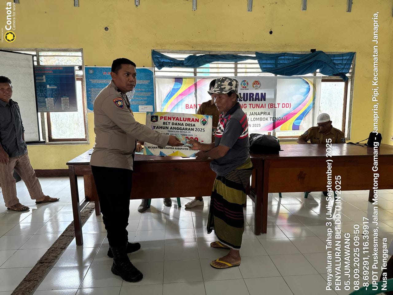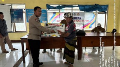 LOMBOK TENGAH – Bhabinkamtibmas Desa Janapria, AIPDA Lalu Suharta, mengawal langsung kegiatan penyaluran Bantuan Langsung Tunai Dana Desa (BLT-DD) Triwulan III (Juli-September) tahun 2025 di Kantor Desa Janapria pada Senin, 8 September 2025.