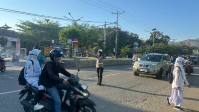 Kota Bima, NTB (22 September 2025) – Anggota Lalu Lintas Polsek Rasanae Barat Polres Bima Kota melaksanakan kegiatan Rawan Pagi/Strong Point Pagi pada Senin (22/9/2025) sekitar pukul 06.30 Wita. Kegiatan tersebut berlangsung di depan MTsN 1 Kota Bima dengan sasaran pengguna jalan, baik pejalan kaki, pengendara roda dua (R2), roda empat (R4), maupun masyarakat yang beraktivitas pada pagi hari.
