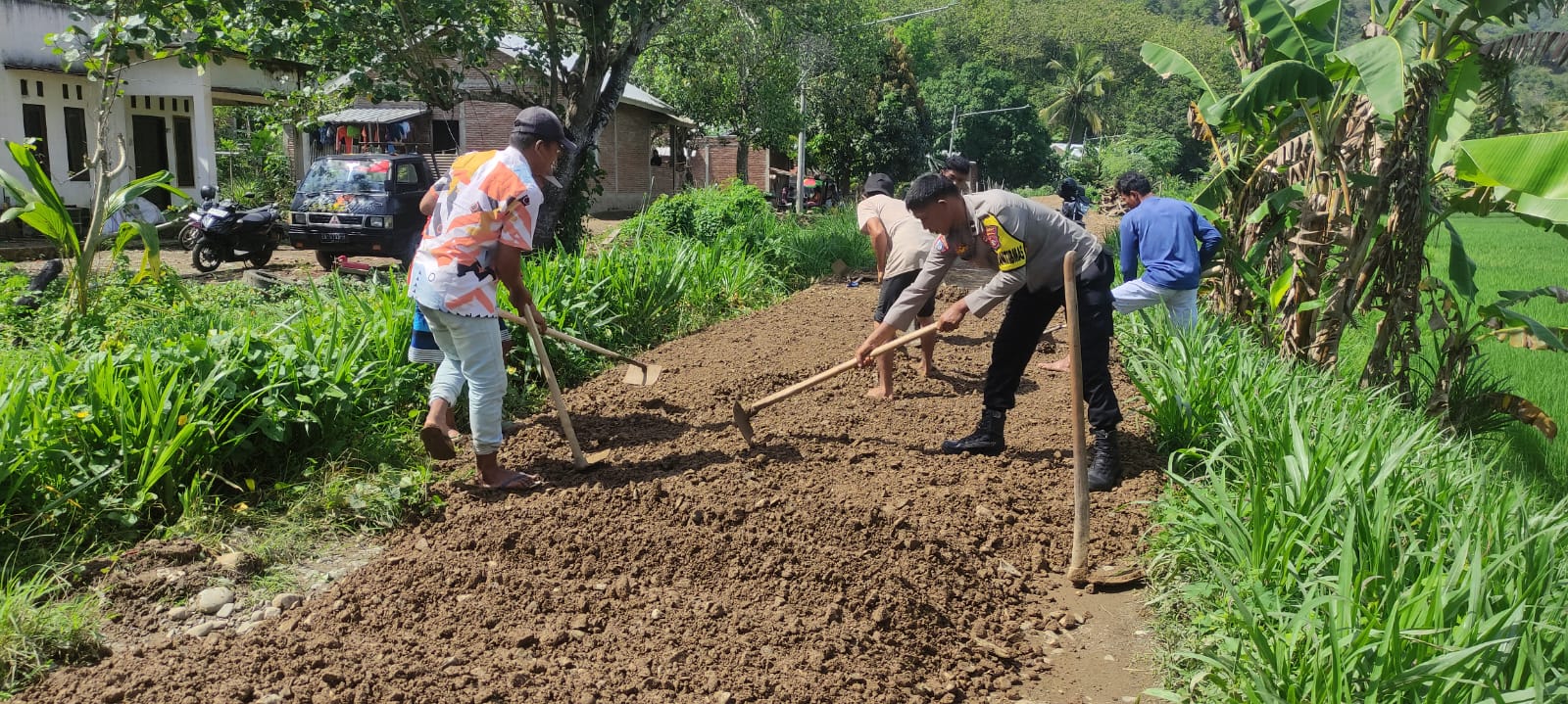 Bhabinkamtibmas bersama masyarakat bahu-membahu memperbaiki jalan desa agar dapat kembali dilalui dengan aman dan nyaman oleh warga. Gotong royong ini merupakan wujud kebersamaan dan sinergi antara Polri dan masyarakat dalam menjaga serta membangun lingkungan.