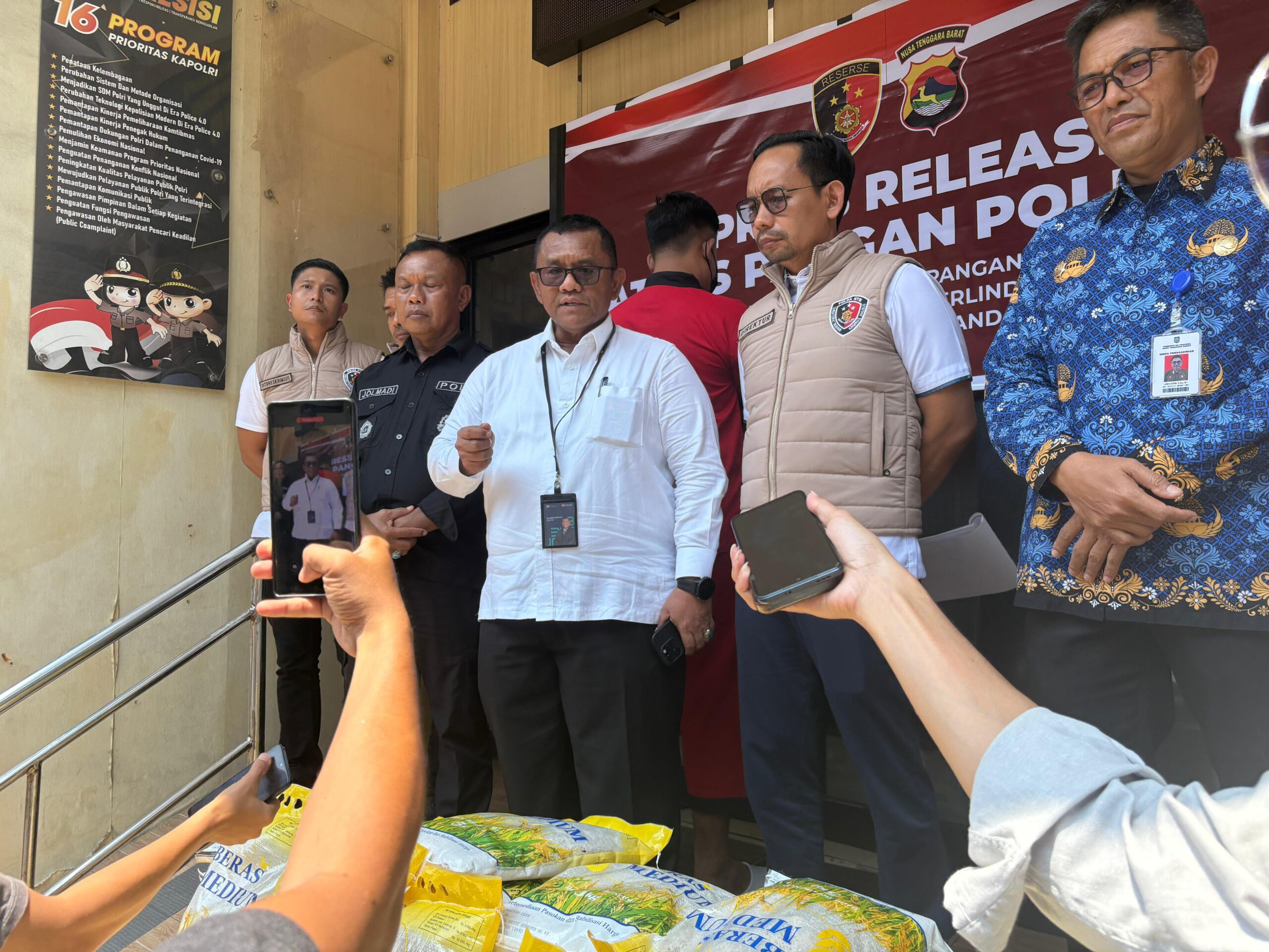 Hadir dalam Konferensi pers tersebut Pemimpin wilayah Perum BULOG NTB Mara Kamin Siregar, Kadis Perdagangan NTB Jamaluddin Malik, Kasubdit Indaksi Ditreskrimsus Polda NTB Kompol Moh. Nasrullah SIK., Kasubdit Penjas Humas Polda NTB serta Tersangka NA dan seperangkat barang bukti.