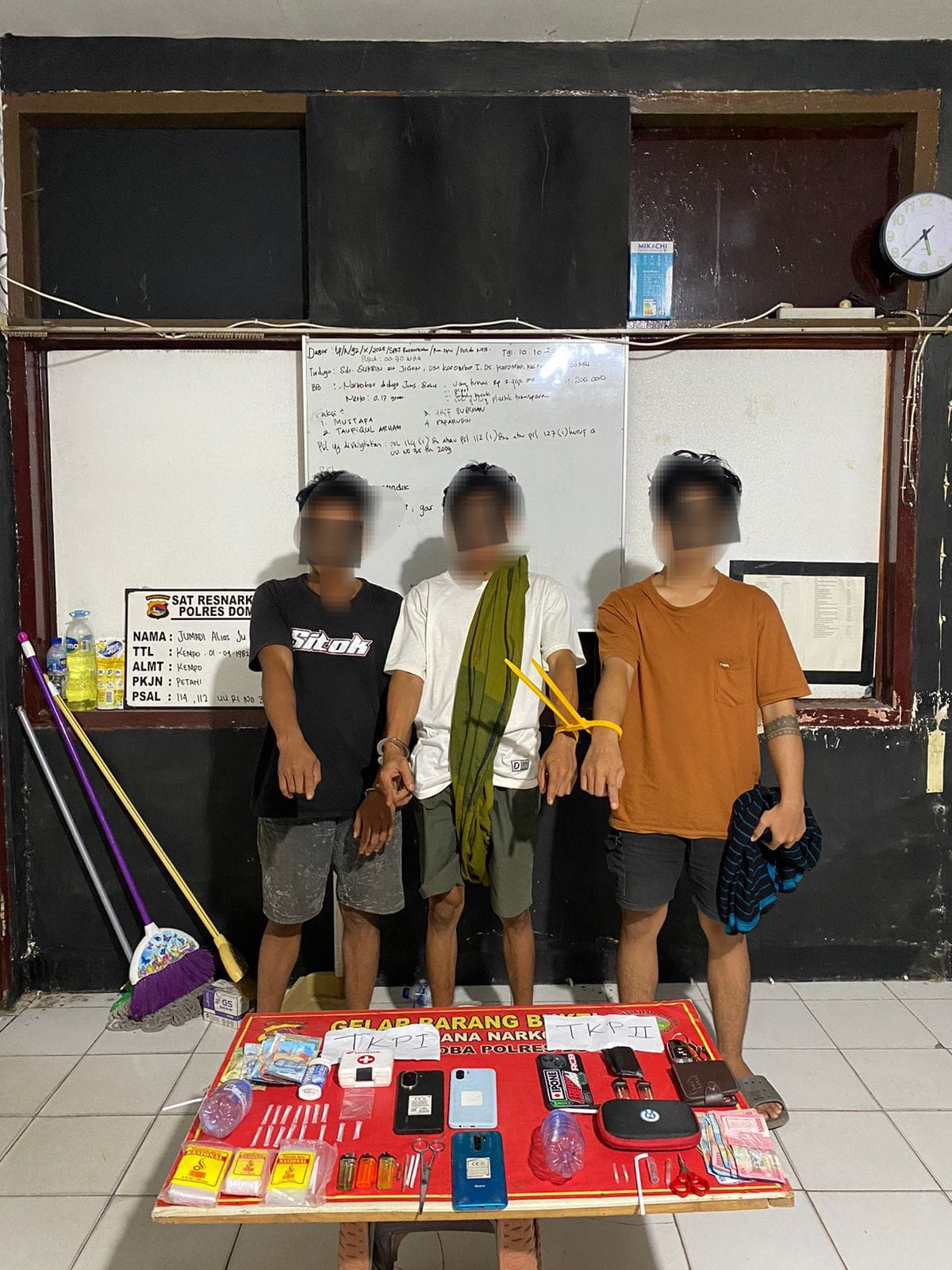 Sekitar pukul 13.30 Wita, tim tiba di rumah terduga W (41) dan menemukan dua orang pria, yakni W dan L.A (29), sedang berada di dalam rumah. Setelah dilakukan penggeledahan disaksikan oleh dua orang saksi dari masyarakat setempat, petugas menemukan 13 poket sabu siap edar, alat hisap (bong), serta uang tunai hasil transaksi.