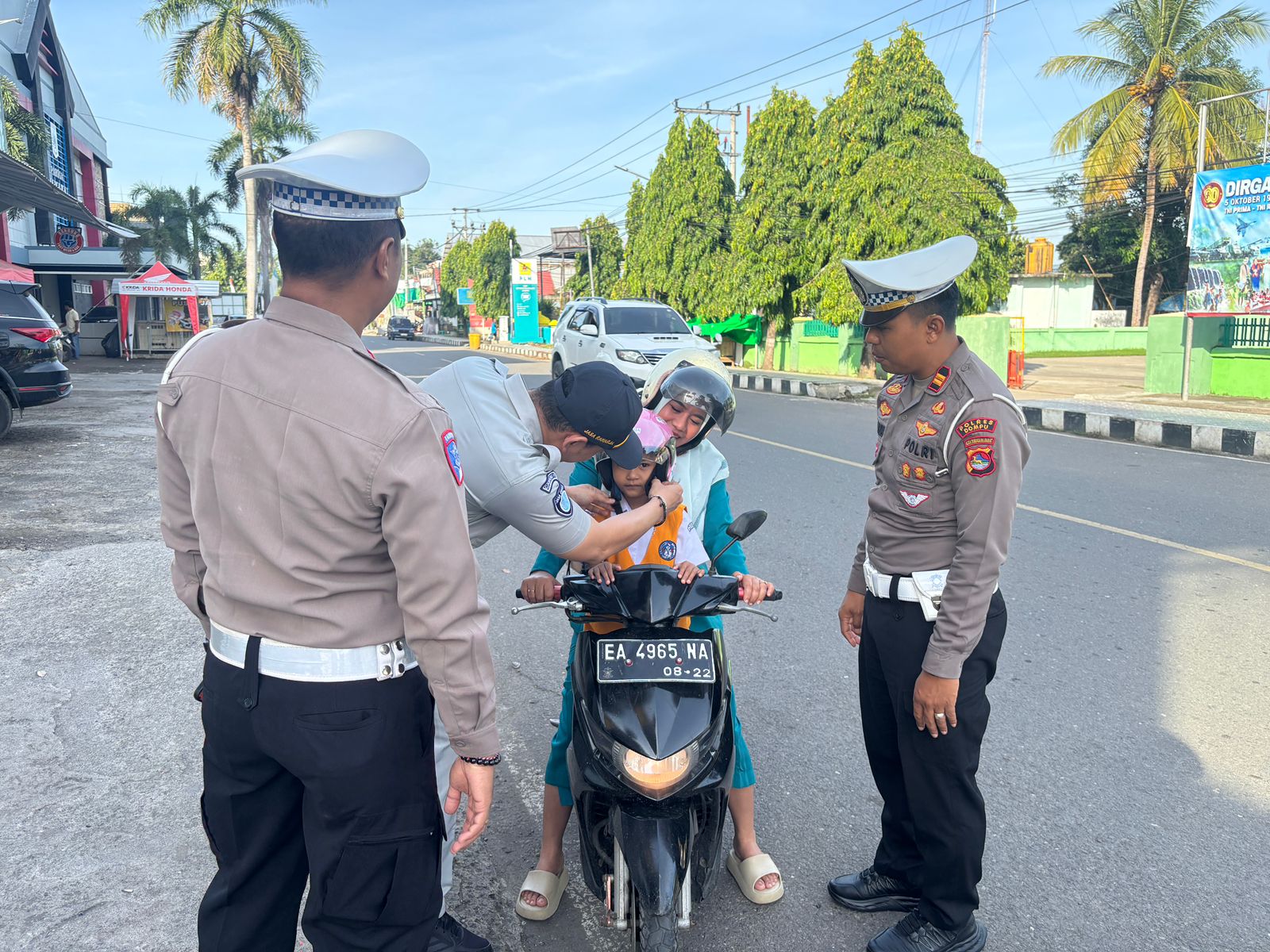Kegiatan ini dilaksanakan hari ini Selasa 25 November 2025 Pukul 07.00 WITA bertempat di Traffic Light Koramil Kota, Jalan Soekarno-Hatta, Kabupaten Dompu. Sasaran kegiatan adalah anak-anak yang diantar orang tuanya menggunakan sepeda motor saat berangkat ke sekolah. Selain pembagian helm, personel Satlantas Polres Dompu juga memberikan edukasi singkat kepada para orang tua dan anak-anak tentang pentingnya penggunaan helm SNI serta tertib berlalu lintas di jalan raya.