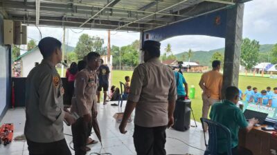 Sumbawa Barat, 29 Oktober 2025 — Personel Polsek Taliwang melaksanakan pengamanan ketat pada gelaran Turnamen Sepak Bola Kades Cup III