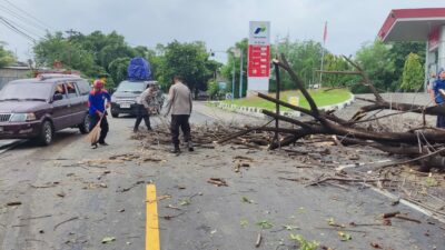 Lombok Utara – Sebuah pohon tumbang tutupi jalan Polsek Kayangan bersama Damkar Kecamatan Kayangan respon cepat evakuasi pohon, Jumat